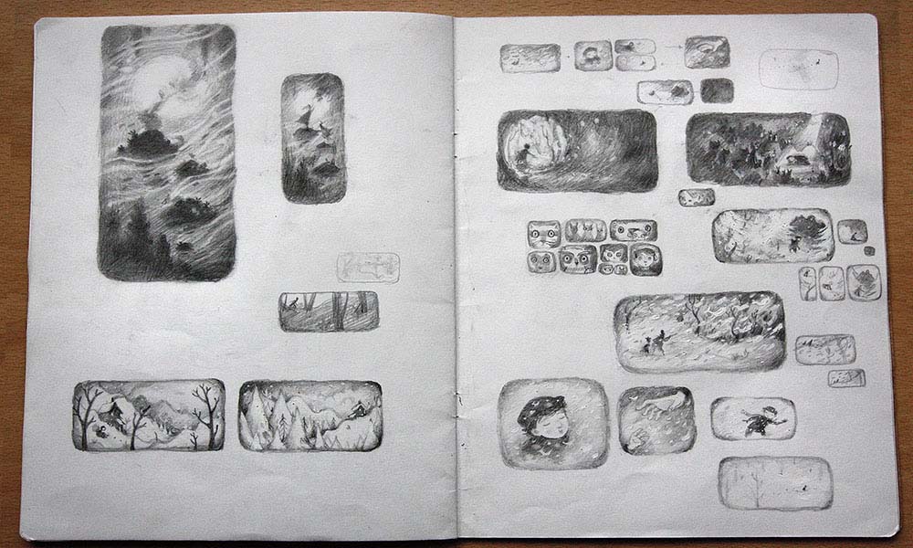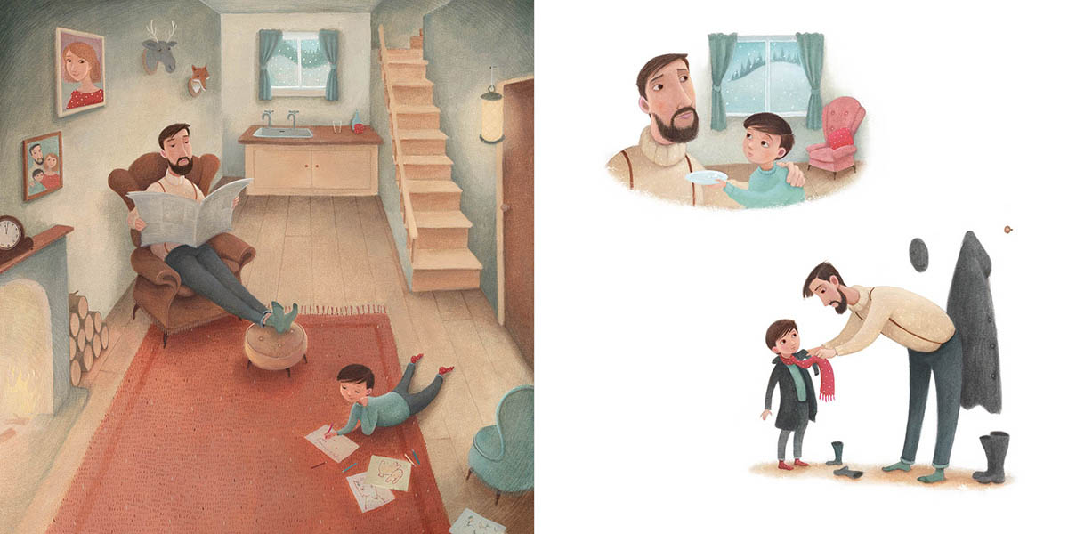 Initially, I had been inspired to create imagery set in a snowy mountain landscape. Doodling in my skecthbook, I drew a boy and his father and began to explore their relationship set against this wintery backdrop. I had certain visual ideas for sections of the story which unfolded as I made connections between the landscape and the boy's imagination, slowly a clear narrative developed.