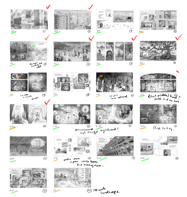 I quickly decided to remove any words from the book and concentrated on trying to tell the story purely through imagery, developing the characters and sequencing the sections together. Some of the photographs posted here document my sketchbook development. They show how I evolved my initial ideas into more detailed roughs, a working storyboard and mock-up dummy books, which allowed me to physically test the pacing and flow of the imagery as a whole.